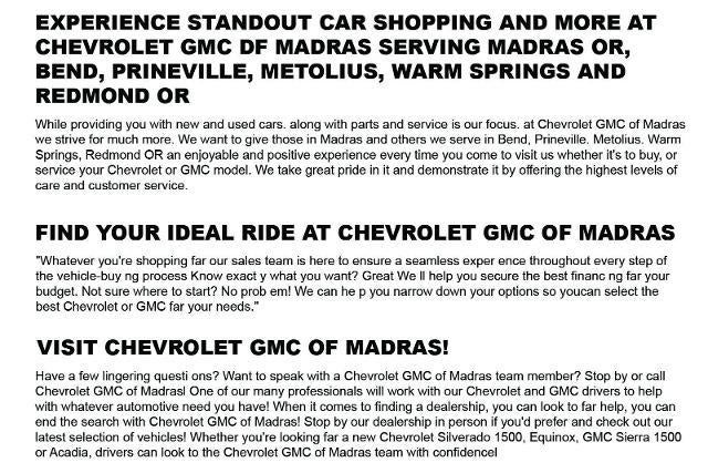 All Vehicles The Manufacturer's Suggested Retail Price excludes tax, title, license, dealer fees and optional equipment. Dealer sets final price. Tax, title, license and dealer fees (unless itemized above) are extra. Not available with special finance or lease offers. While every reasonable effort is made to ensure the accuracy of this information, we are not responsible for any errors or omissions contained on these pages. Prices subject to change without notice. See dealer for complete details. Any Lead form or any form completed affiliated with Chevrolet GMC of Madras. You opt into SMS & Text upon any form completion. Our Sales, Parts, Or Service team will be reaching out to you soon. We look forward to earning your business.